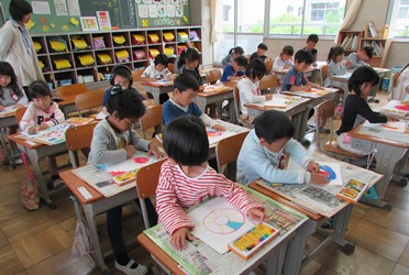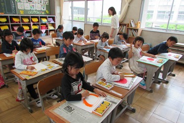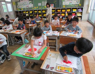 1年2組の図工の授業の様子です。 「おひさま にこにこ」という題の絵を描いています。