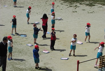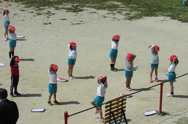 2年2組の体育の授業の様子です。 準備運動で腕のストレッチを行っているところです。