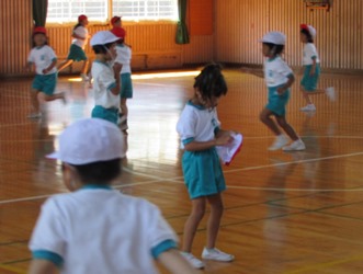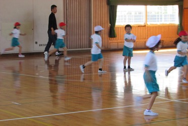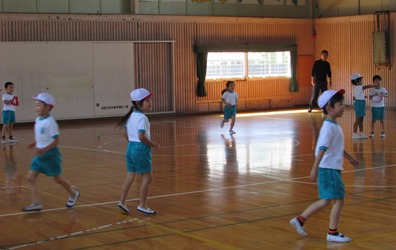 1年2組が体育の授業で鬼ごっこをしました。 体育館でみんな元気よく走り回っていました。