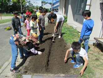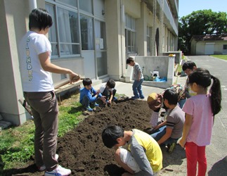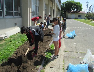 特別支援学級の3・4・5組の子どもたちが花壇を耕し、畝を作って二十日大根などの種まきをしました。早く芽が出てくるといいですね。