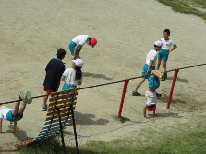4年1組の体育の授業の様子です。 鉄棒運動でいろいろな種目に挑戦しています。