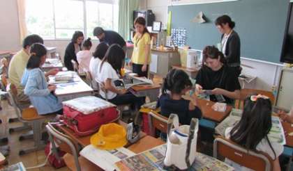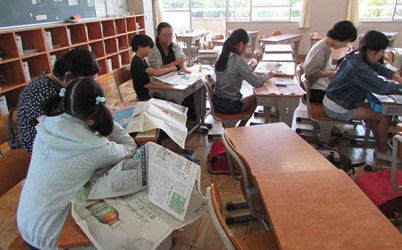 6月2日のふれあい講座「新聞紙でブローチ」の様子です。 5年1組の教室で行われました。