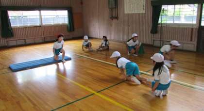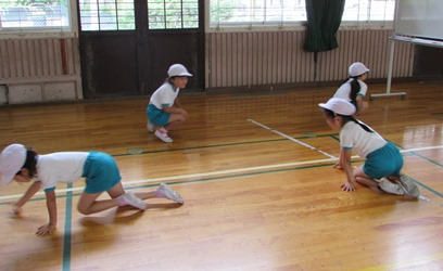 2年1組の子どもたちが体育の授業で、一生懸命に「体つくり運動」に取り組んでいました。