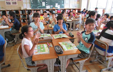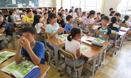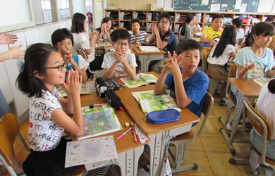質問や答えを英語で言うときに、みんなで手拍子しながら、会話したので、とても盛り上がりました。