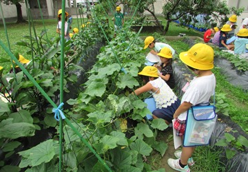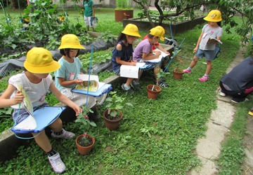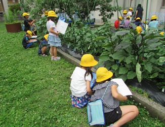 2年2組の生活科の授業で、子どもたちが花壇や鉢に定植した野菜の観察をしていました。