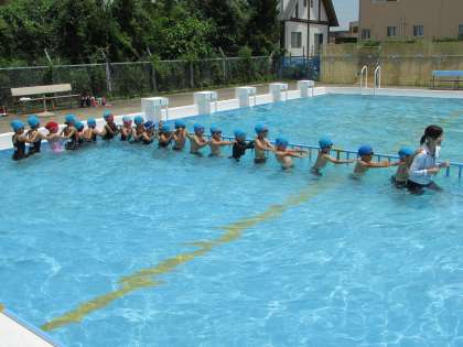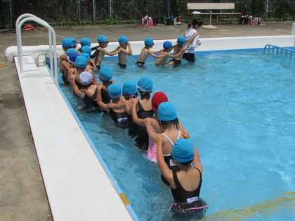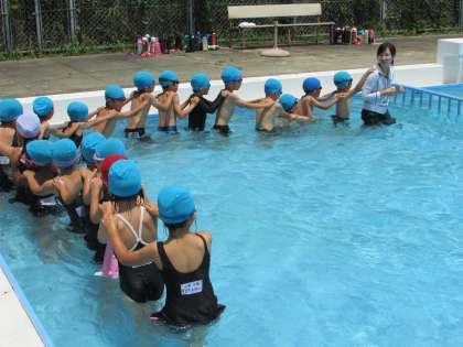 少し寒かったようですが、1年2組の子どもたちが水中電車などでプールを楽しみました。