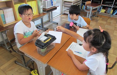 2年1組の子どもたちが、生活科の授業でカタツムリやダンゴムシの観察記録を作っていました。