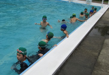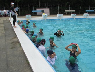 5年1組の水泳の授業の様子です。 さすがに高学年プールの方は水深が深そうですね。