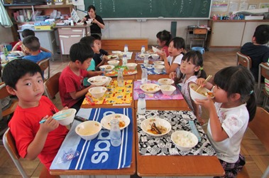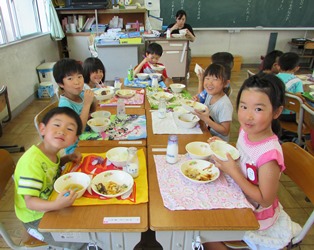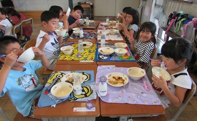 1年1組の子どもたちが、マナーよく、静かに給食を食べていました。