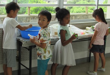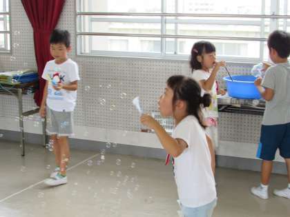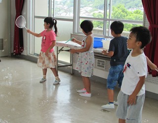 1年2組の子どもたちが、グループごとで協力して、いろいろな道具を使ってシャボン玉を作りました。