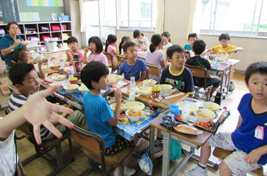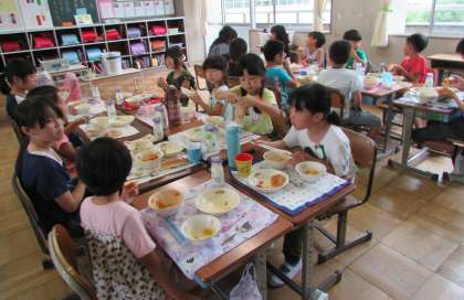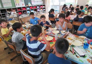 2年生と4年生のふれあい給食の様子です。 ペア学級でいっしょに給食を食べました。