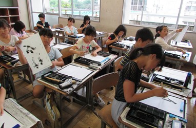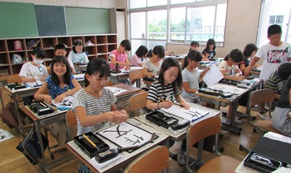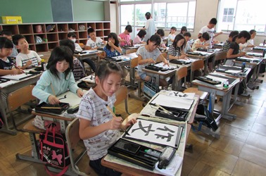 4年1組の書写の授業の様子です。 「作文」という漢字を毛筆で書く練習をしていました。