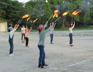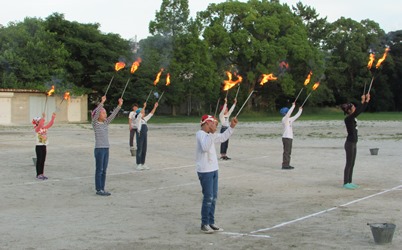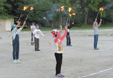昨日の夕方18時から、運動場で5年生の子どもたちが林間学校のトーチ・トワリングの練習をしました。