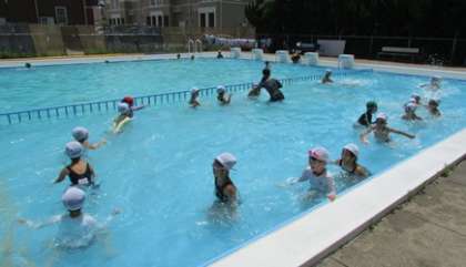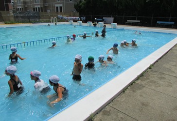 プールの中を一方通行で、円を描くように速く歩くと、一方向に水の速い流れができて、楽しい準備運動になります。