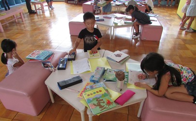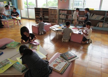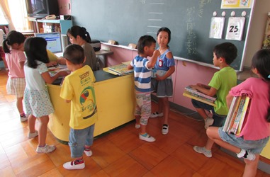 終業式の前日、1年1組の子どもたちが低学年図書館で、たくさん本を借りていました。