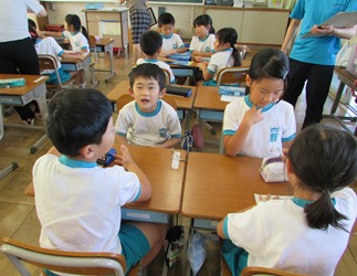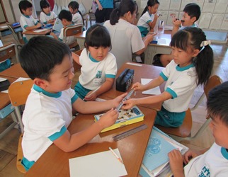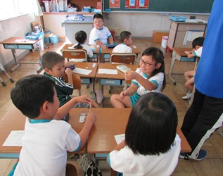 1年1組の算数の授業の様子です。 グループに分かれて物の大きさをくらべていました。