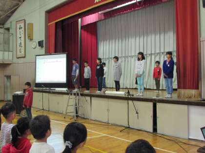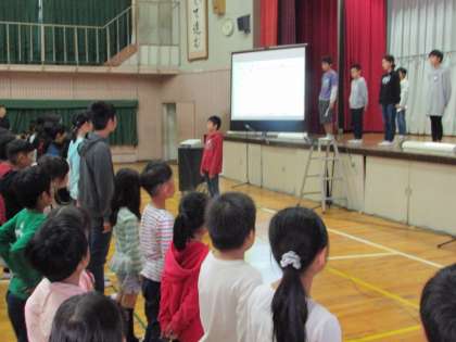 10/25 スマイルタイム1 公開日 2018/10/25 更新日 2018/10/25 大野小の部屋 今日10/25(木)のスマイルタイム(児童朝会)は、図書委員会の発表でした。 児童会役員の子どもたちの進行で行いました。 いいね(0)