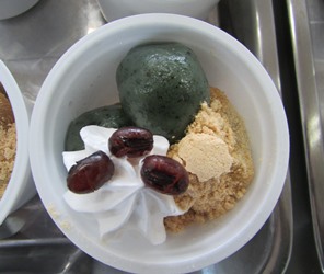 「わらび餅」と「よもぎ団子」に生クリームやかのこ小豆がのっていて、見た目もかわいかったですが、味も抜群においしかったです。