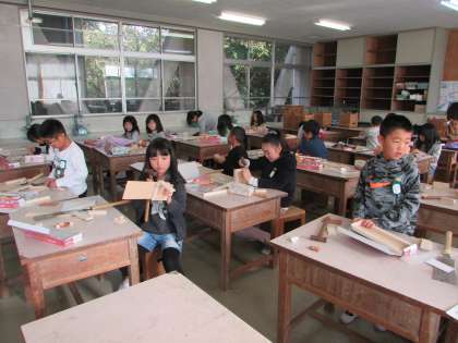 11/23 4年 図工3 公開日 2018/11/23 更新日 2018/11/23 4年生の部屋 4年1組の子どもたちが、板を切ったり、金づちでくぎを打ったりして、鉛筆立てや小物入れなど、生活で使える作品を作っていました。 いいね(0)