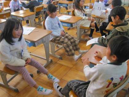 11月19日(火) 1の1 外国語 公開日 2024/11/19 更新日 2024/11/19 1年生の部屋 今日は1年生も外国語の授業がありました。ペアになって、「What is this(これなあに)?」「It is an apple(リンゴだよ)!」果物の絵を使いながら答えていました。 いいね(0)