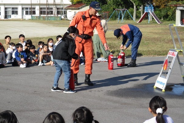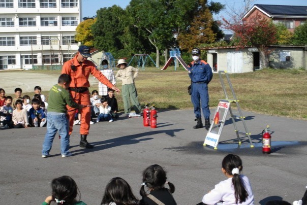 消防署の方にも来ていただき、代表児童が消火器の使い方の訓練もしました。