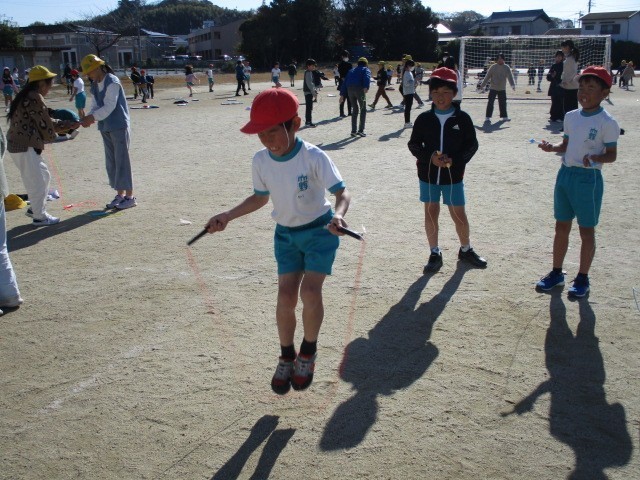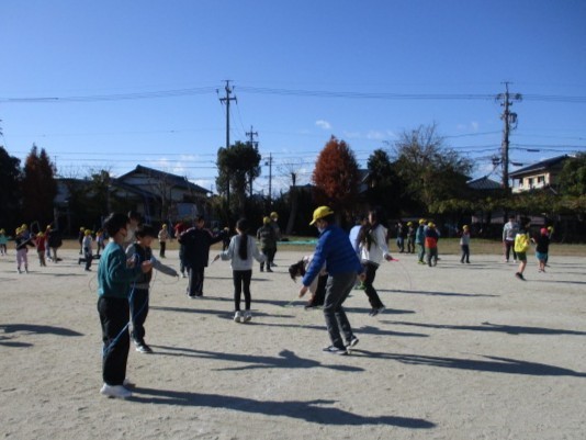 大放課はみんなで運動場に出て、なわとびに励みます。