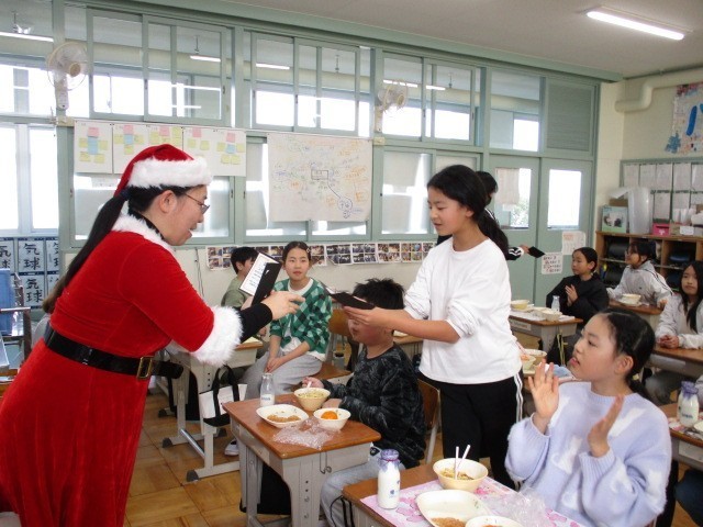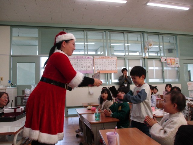 今日の給食の時間にサンタが教室を回って、各学級に1セットずつ大野小オリジナル宇宙トランプをプレゼントしました。