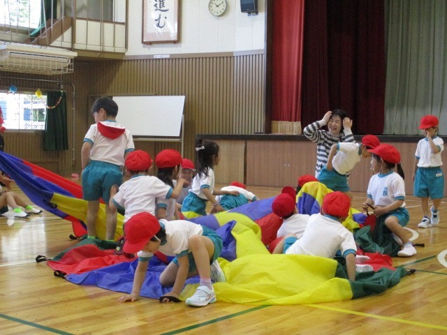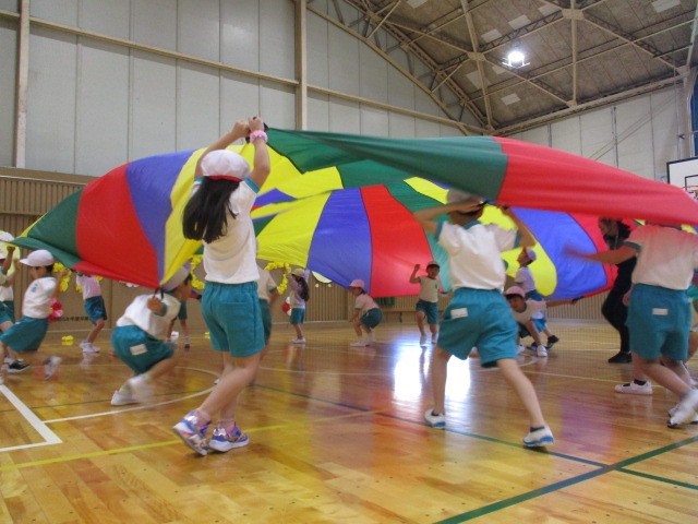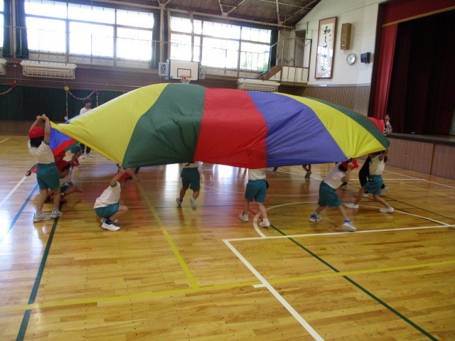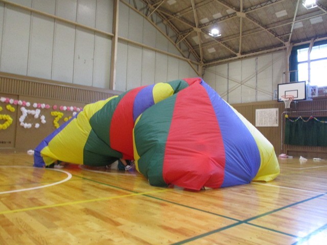 みんなで揺らして波を起こしたり、大きくふくらませて全員でもぐりこんだり、玉入れの玉を花火みたいに飛ばしたりしていました。