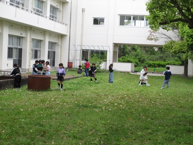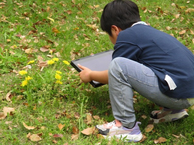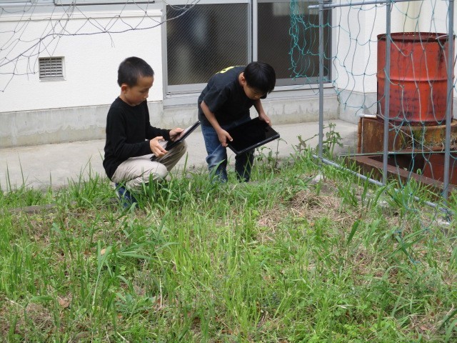 運動場や中庭で春の植物を探し、タブレットで写真を撮りました。
