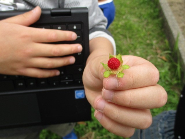 ヘビイチゴの実も見つけました。食べられるのかどうか、さっそく調べていました。