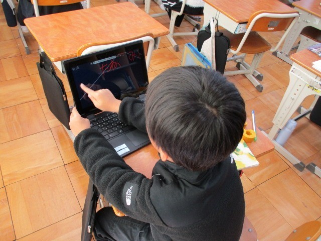 教科書のQRコードから、タブレット上でも操作できる扇のアプリを使って、いろいろな大きさの角を作ったり、三角定規の角の大きさと比べたりしました。
