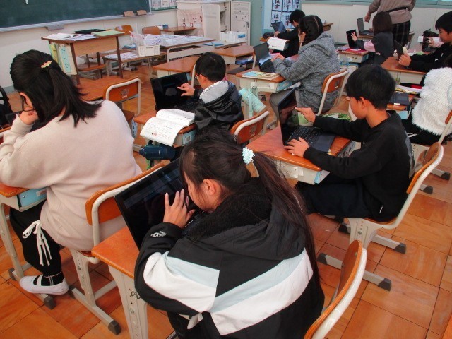 今日は1日の中で気温はどのくらい変化するのかを調べていました。校内のどの場所を調べるか担当者を決め、1時間おきに気温を測ってタブレットで記録を残しました。