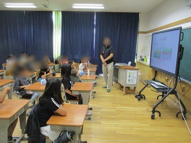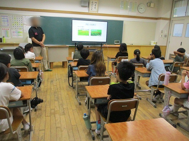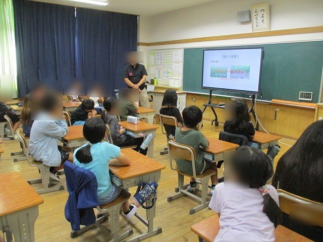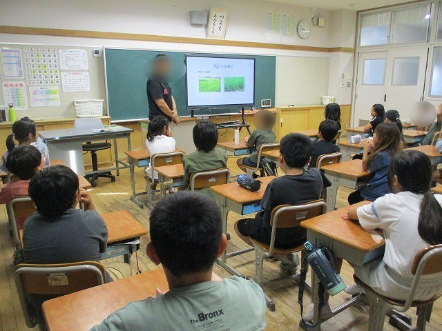 1学期に植えた稲が、育ってきた様子を写真で見せていただき、来週稲を刈るときの方法や注意について聞きました。