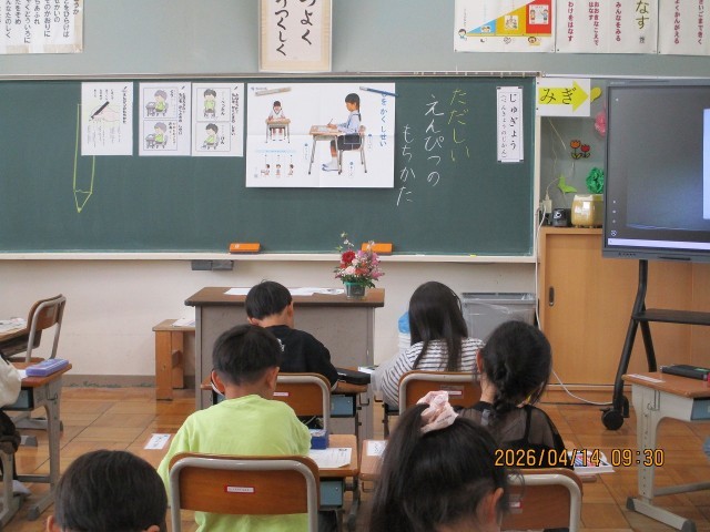 1年生は、鉛筆の持ち方や字を書く姿勢を教えてもらい、線なぞりのプリントを行いました。