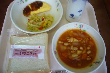 今日はスライスパンでした。いちごジャムをぬり、野菜ソテーも挟んでサンドウィッチ風にしていただきました。チキンビーンズはトマトスープのうまみが具にからみ、おいしかったです。