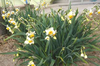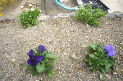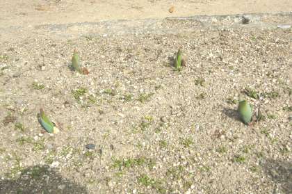 パンジーやノースポール、スイセンが花を咲かせている中、1年生の学年花壇ではチューリップが芽を出し始めました。