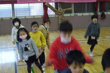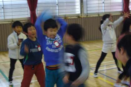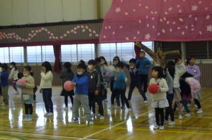 体育館で、6年生を送る会の歌練習と学年レクをしました。