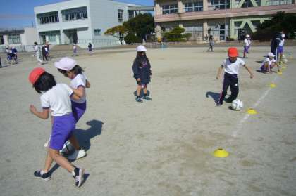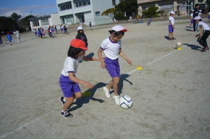 ソフトバレーボールにつなげていくプレルボールや、ボール運動でのサッカーをしました。