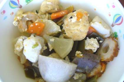 今日はごはんにニンジンそぼろごはんの具をまぜて、手巻きのりで巻きごはんにしました。根菜類たっぷりの関東煮や愛知県産の野菜がしっかり入ったコロッケもおいしくいただきました。