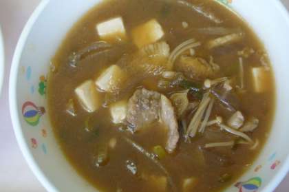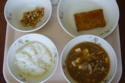 今日は豚汁でした。呼び方は、ぶたじる?、とんじる?と職員の中でも分かれますが、給食はぶたじるです。みその香りの中でねぎや玉ねぎの甘みが引き立ち、お肉も柔らかく、おいしかったです。11月の料理紹介の一品でもあった大豆のアーモンドがらめはカリカリとしっかり噛んでいただき、あかもく入りのたれが抜群のはんぺんのあかもくたれかけもおいしくいただきました。