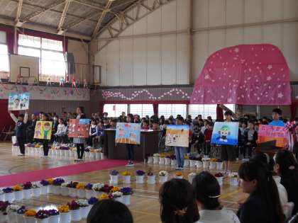 1年生の担任発表のあと、児童会の子どもたちが、自分で作った絵を見せながら、鬼崎北小学校の1年間を紹介してくれました。1年生のみんなはしっかりと聞いていました。