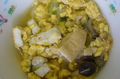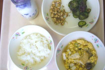 今日はたまごとじでした。たまごのやわらかさがほどよく、やさしい味でした。大豆と小魚のアーモンドがらめのぽりぽり感やきゅうりのゆかりまぶしの塩味を味わいながらいただきました。