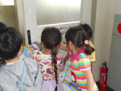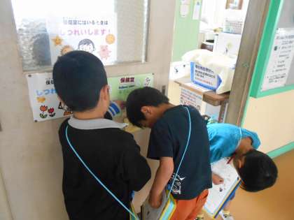 1年生が学校探検をしました。2時間目は、特別教室(11部屋)をグループで回ってシール集めです。校長先生にも、きちんとごあいさつができました。コンピュータルームを探すのに苦戦しているグループがちらほらありました。迷わずに行けたかな。