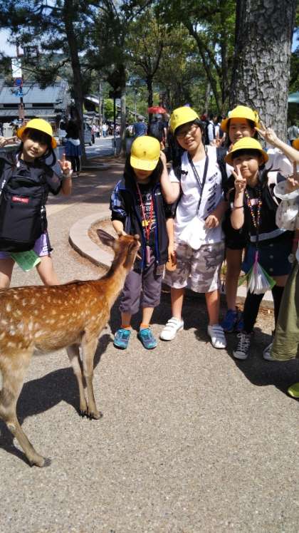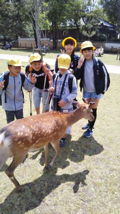 奈良公園に着きました。ドキドキしながら,鹿におせんべいをあげてみました。