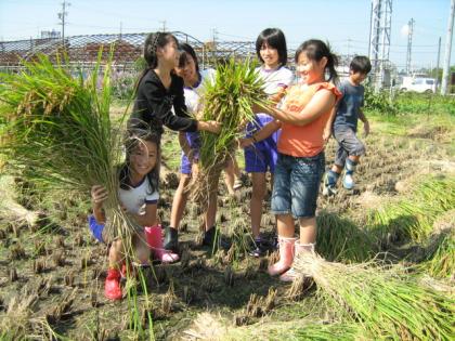 6月に植えた稲が実り、稲刈りを行いました。秋空の下で、金色に実った稲を鎌で刈り、中村さんが束にしてくれました。田植えの後、ここまで稲の面倒をみて大きくして下さった中村さんや農協のさくら支店のかたに感謝の気持ちを伝えました。12月の餅つきをみんなで今から楽しみにしています。