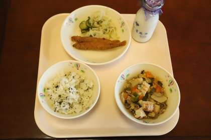 今日の給食は私の大好物である「わかめごはん」でした。さらに,「ひきずり」がおいしくて思わずたくさん食べてしまいました。今日はしっかりと運動をしないといけませんね。みなさんも,好きすぎて,つい食べ過ぎてしまうなんてことはありませんか?