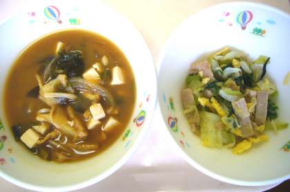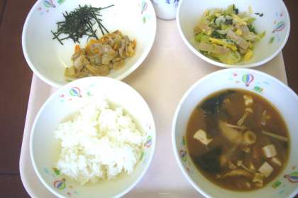 今日は今月の応募献立「ブヒブヒのり豚丼」でした。ごはんの上に乗せて、はい、できあがり!。おいしくいただきました。じゃがいものみそ汁はジャガイモのほっこりとした食感もよく、マイルドな味のみぞ汁でした。ハム、たまご、こまつな、もやし、キャベツが和えられた千草和えのさっぱり味は豚丼によく合っていました。