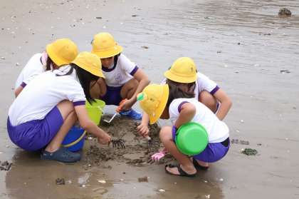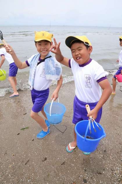 「見つけた〜」と大きな声が聞こえて振り向くと見つけたのはカニだったり,ヤドカリだったりすることもありましたが,一足早い潮干狩りができて,子どもたちの笑顔がいっぱい見られました。