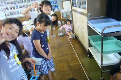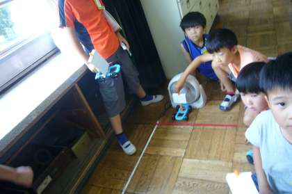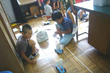 帆かけ車に送風機で風を当て、当てる風の強弱で車の移動距離がどう違うのかを調べました。