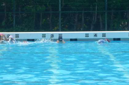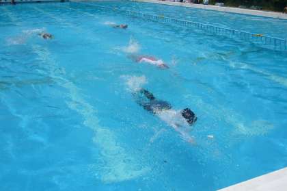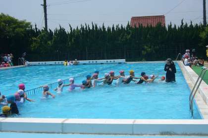 低学年は列車歩きなどで水に親しみ、高学年は25m泳をしていました。
